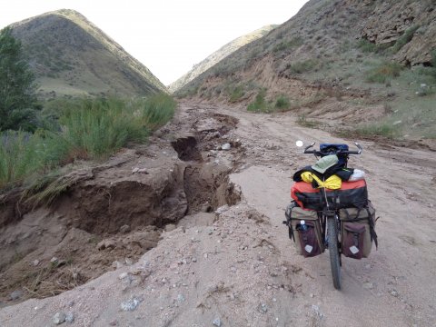 Dog viste det sig at være relativt nemt for mig at trække cyklen fri af de dybe huller, mens de firehjulede køretøjer nok ville få problemer. Resten af dagen havde jeg i hvert tilfælde sporet for mig selv, hvilket jeg satte stor pris på efter de mange dage på den trafikkerede vej langs Issyk-Kuls søbred.