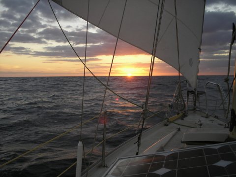 Da jeg forlod Madeira søndag den 17. maj blæste det friskt fra nø, og det gik faktisk så strygende med vinden ind tværs, at jeg næsten var halvvejs på to døgn. Som forudsagt tog vinden dog gradvis af i styrke, og sent på ugens torsdag døde den helt. Samme dags eftermiddag friskede vinden dog op fra ønø, og jeg nød skumringstimen på havet uden de sædvanlige dønninger og trættende tværgående sø. Fredag morgen - efter 5 døgn på havet - bød vejrguden på byger og opfriskende vind fra nordvest, så de sidste 20 sømil sejlede jeg hård bidevind med to reb i storsejlet.